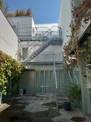さらにはソリッドな白い面とガラス、将来的には緑が茂るであろうメッシュが軽さを印象付けています。