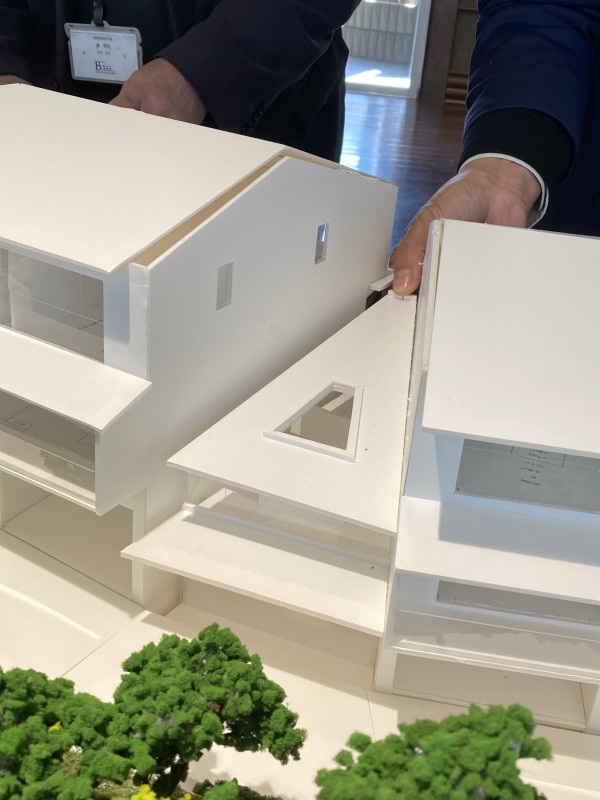 弊社BAミュージアムで庭園を望むエントランスの屋根の勾配を確認しています。