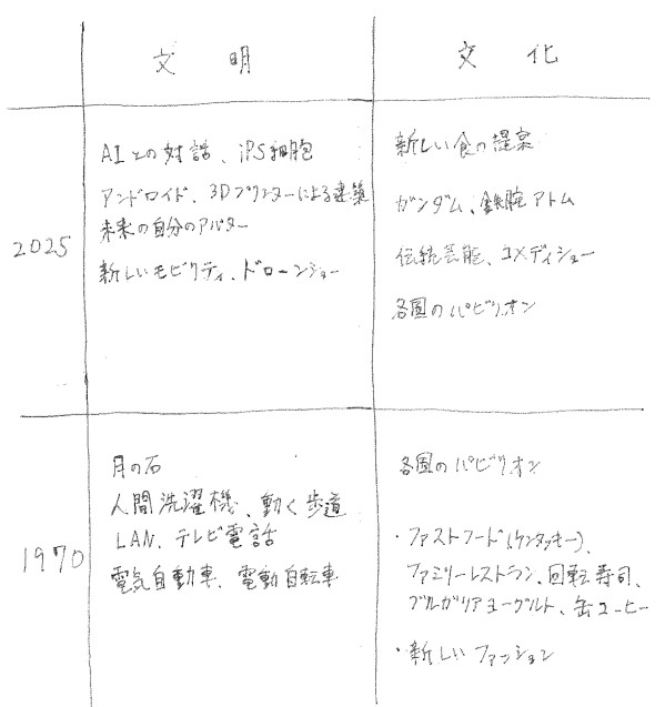 ところで、今も昔も万博での展示は文明/文化に類別できるのではないかと考えています。