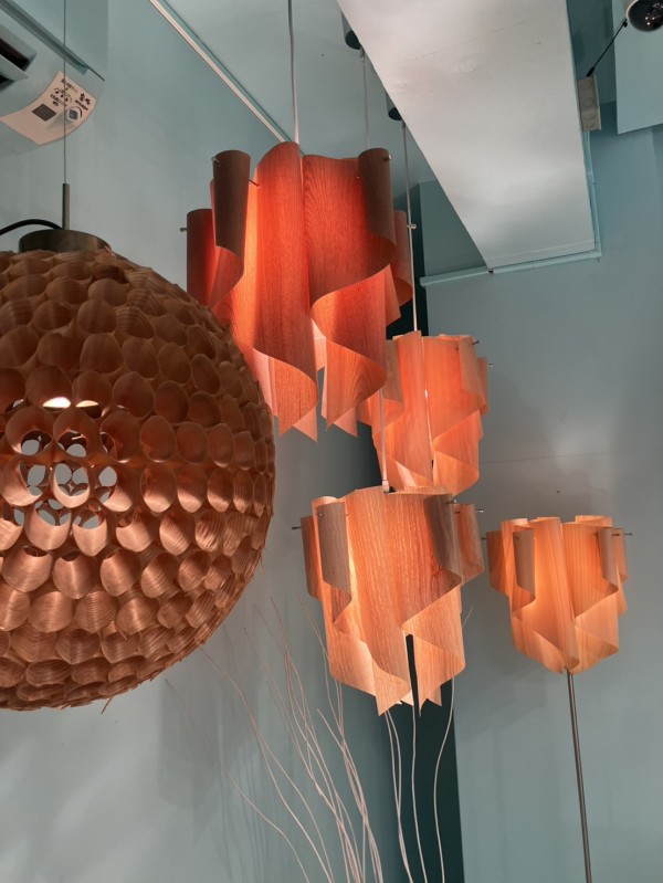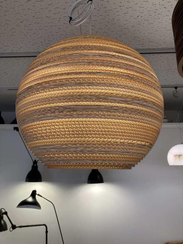 こちら廃材の段ボールを再利用した照明になります。段ボールを円形に切ると断面がグラデーションのように変化するのを利用して柄を表現しています。さらに光の透過によって断面の柄がより強く表れています。