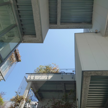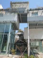 さらにはソリッドな白い面とガラス、将来的には緑が茂るであろうメッシュが軽さを印象付けています。