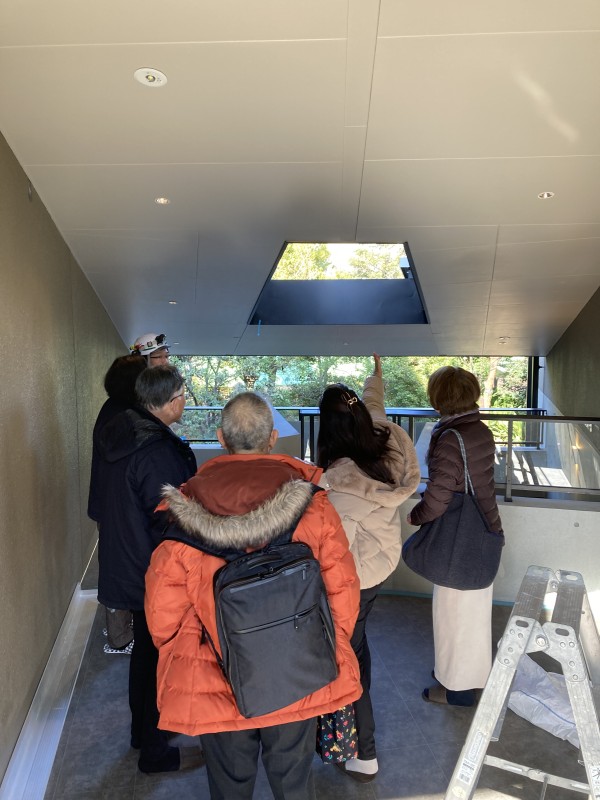 弊社BAミュージアムで庭園を望むエントランスの屋根の勾配を確認しています。